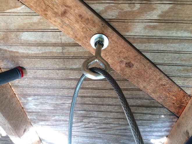 With the bolt in the back of the shed, I fed the cable through the eyebolt, wrapped it around both bikes and secured it with the DialUp.