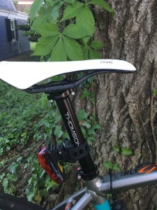 The PRIME is a slim, racy looking saddle that would look good atop most any road or mountain bike. As noted, I got the All White version of the PRIME. It’s also available in a solid black version (called the All Black), Titanium Arrow (gray stripes on white) and Ghost Arrow (gray stripes on black).