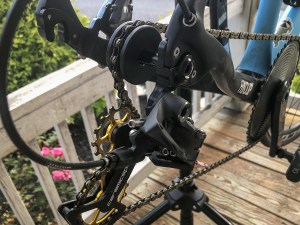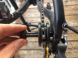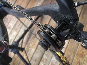 In use, the Drive Thru was a breeze. With the wheel off, it threaded easily into the Mavic SpeedRelease dropout on the Van Dessel Full Tilt Boogie. I used it numerous times, but specifically when cleaning the frame or swapping wheels. I don’t clean the chain while it is on the bike, but it held the chain in place and off the chainstay while cleaning the back end of the bike. I did spin the crank and shift gears and it was cool to see the wheel slide from side to side as the rear derailleur moved through the imaginary gears, which helps with checking derailleur movement or cleaning it. Right after the Topeak Prepstand Pro, the Drive Thru is the next thing I grab when cleaning or working with the wheel off.
