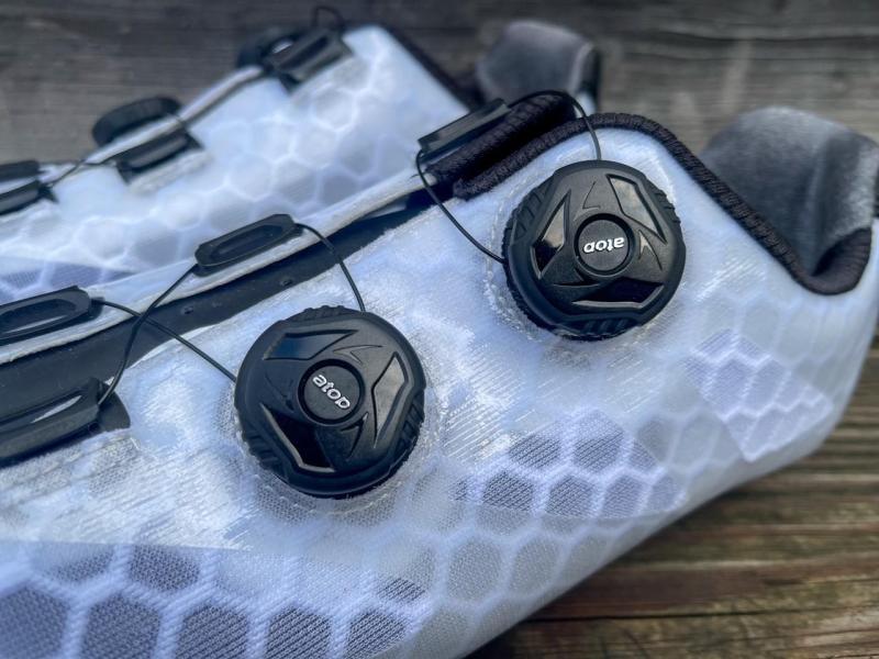 The dials are the ATOP units that you saw on the AR14 helmet as well. They are similar to other dials when tightening, allowing for a precise fit. Loosening them is unique though, as, after a quarter turn backward, they release and allow you to pull open the shoes. The upper dial tightens across the top, while the lower dial controls the lower two levels on the shoe.