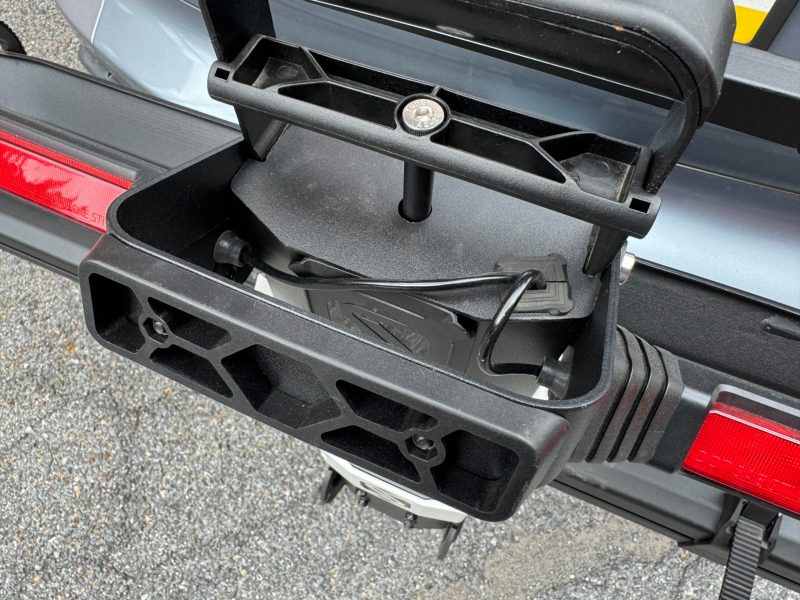 Out on the road, the MHS is rock solid. I did check the hitch pin, but it has not needed tightening in a few months of use. The rack easily rotates up and down, using the handle at the end of the base. When you pull on the handle, it unlocks the base and allows you to lower it. You can have it vertical, what I call “slightly off vertical”, horizontal, and lowered all the way. Lowering it all the way allows you to gain access to the rear hatch while the rack is loaded. The slightly off-vertical gives you another option if you need a little additional room, maybe to open up a rear window for example. Previously on the vehicle, we had an old rack from another brand that was extremely hard for my wife to raise and lower. She is a 5′ 2″ fitness instructor, so it is not for a lack of strength, but the MHS takes much less effort to unlock, raise, and lower, and it also weighs less.